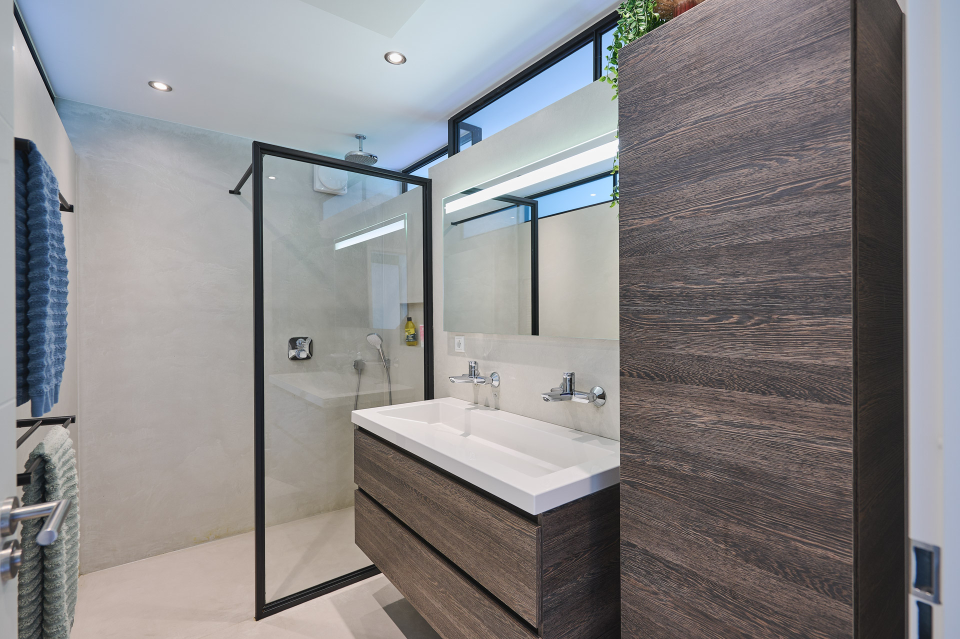 De badkamer is voorzien van een ruime stortdouche. De dubbele wastafel is voorzien van een grote, verwarmde spiegel. Er is ruim voldoende kastruimte voor al uw toiletspullen. Voor de kleintjes is er een krukje om er ook bij te kunnen.